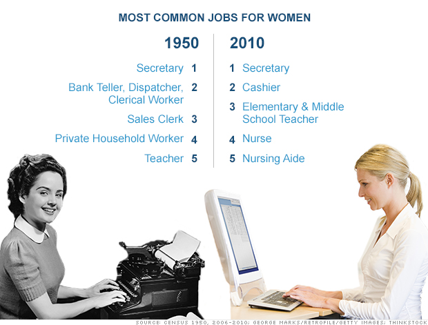 According to an article from CNN Money, these were the most common jobs for women in the 1950s as well as today: