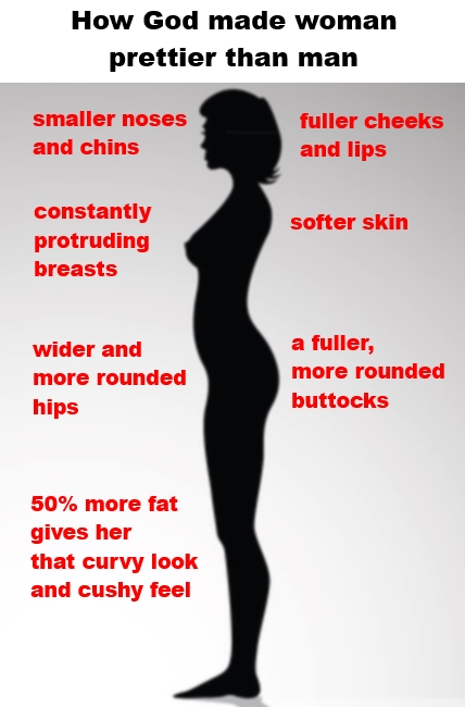 Just as a woman’s mind is soft and gentle, so too her body is soft and gentle. A man’s body is not designed for beauty or appearance, but for work and combat. A woman’s body is the opposite: her body is designed to be beautiful. A woman is God’s most beautiful creation. A woman’s body is designed to serve the needs of men and their children. I realize this statement will be highly offensive to the modern feminist woman, but sometimes the truth is offensive.