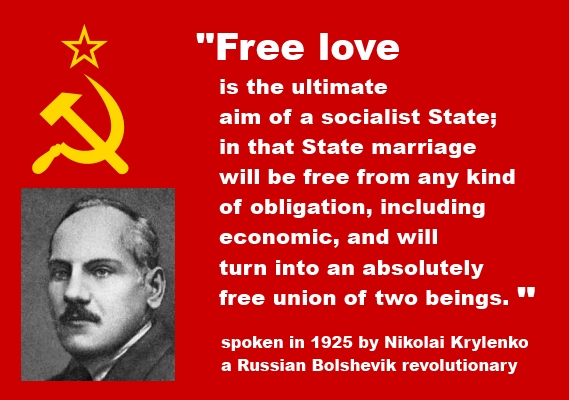 The destruction of traditional marriage is a very old tenant in the Socialist handbook, just as organized religion is. Socialists want people to have their ultimate allegiance to the state. Loyalty to family, or to God threatens ultimate loyalty to the State. That is why Socialist states find every way they can to marginalize religion, and they encourage “free love” because they know free love ultimately builds dependency upon the state.