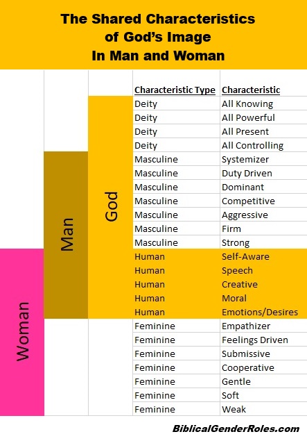 Both man and woman were MADE in the image of God, but only man IS the image God.ย that is a fundamental truth of the Scriptures.ย But what is this difference that the Scriptures are communicating between “made” and “is”.ย ย I think the best way to describe this is to look at the table below illustrating the characteristics of God’s image in both men and women.