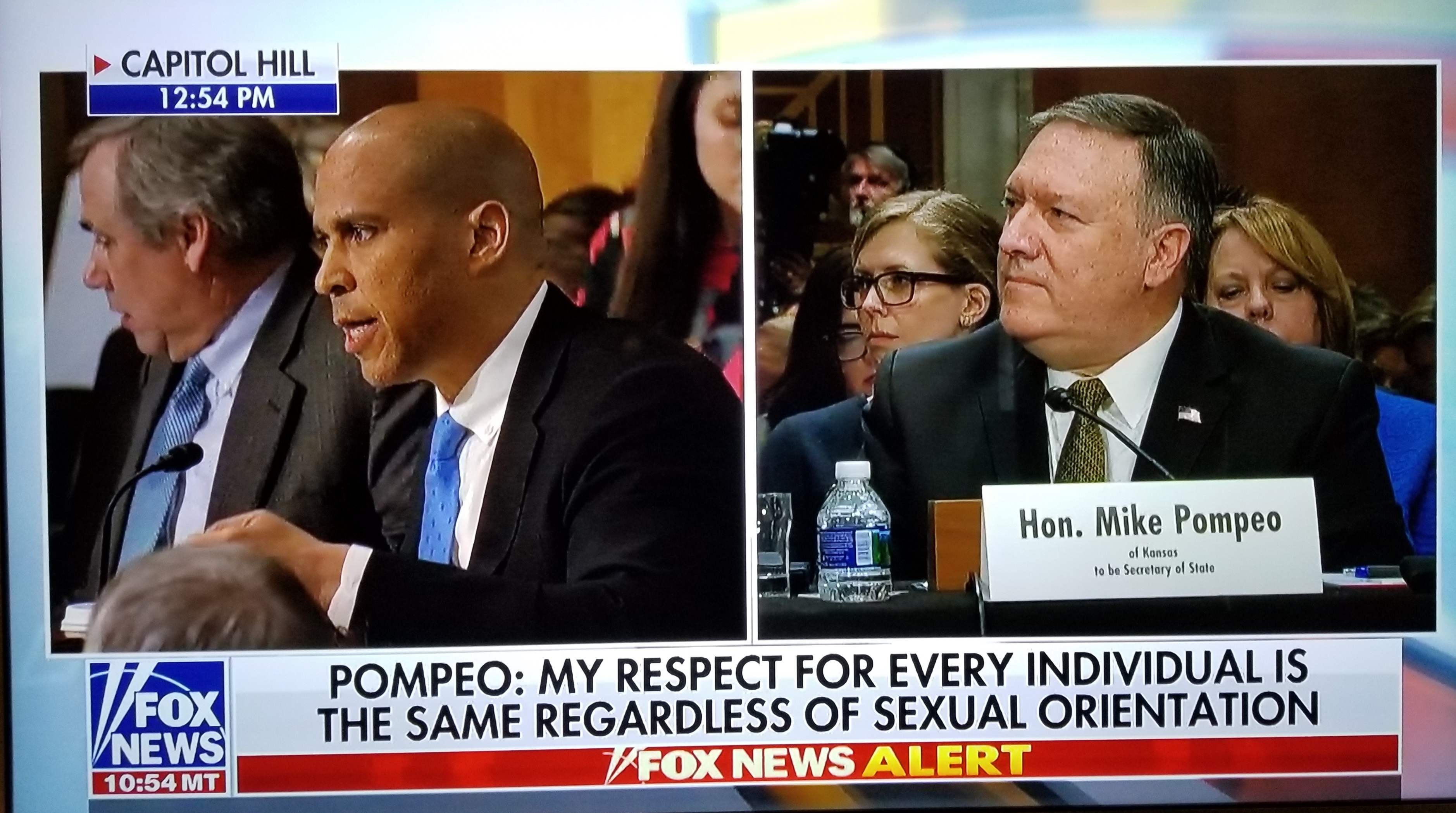 In yesterday’s senate confirmation hearings for his nomination to the position of Secretary of State Senator Cory Booker questioned him as to whether he believed homosexuality was a perversion to which Mike Pompeo responded “When I was a politician, I had a very clear view on whether it was appropriate for two same-sex persons to marry…I stand by that.”